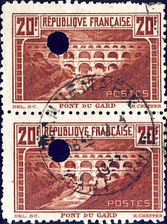 Paire de timbres-poste à 20F Pont du Gard avec perforation circulaire réalisée en 1933 par le bureau de poste de Dannemarie.